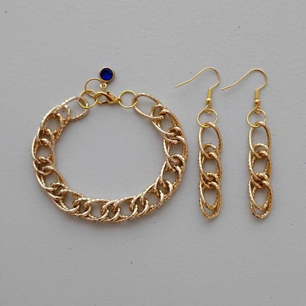 Add to your jewelry collection this elegant textured double link gold chain bracelet and earrings set featuring a glass pendant plated with a thin layer of real 18k gold.